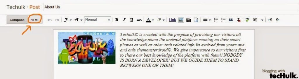STEP 2: Now type everything related to yourself inside the blank post, that you want to shown up in the About section. You can add your own personal favorite image or your brand’s image in it with your description. Place the image anywhere according to your choice inside the post.